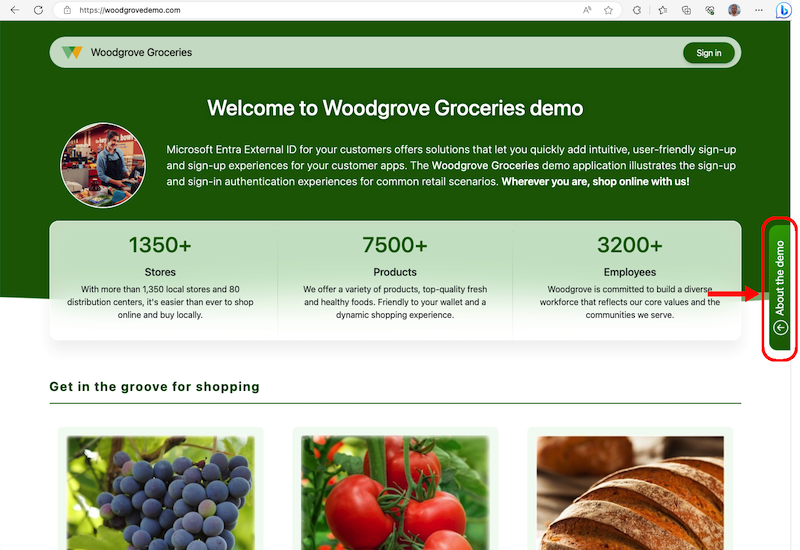 The Woodgrove Groceries live demo illustrates several of the most common authentication experiences that can be configured for your consumer-facing apps.