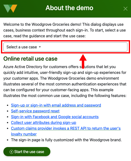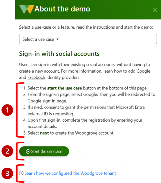 The use cases come with some instructions (1) and button (2) to start the demo and a link (3) to learn how we configured the Woodgrove tenant. Read the instructions and start the use case.