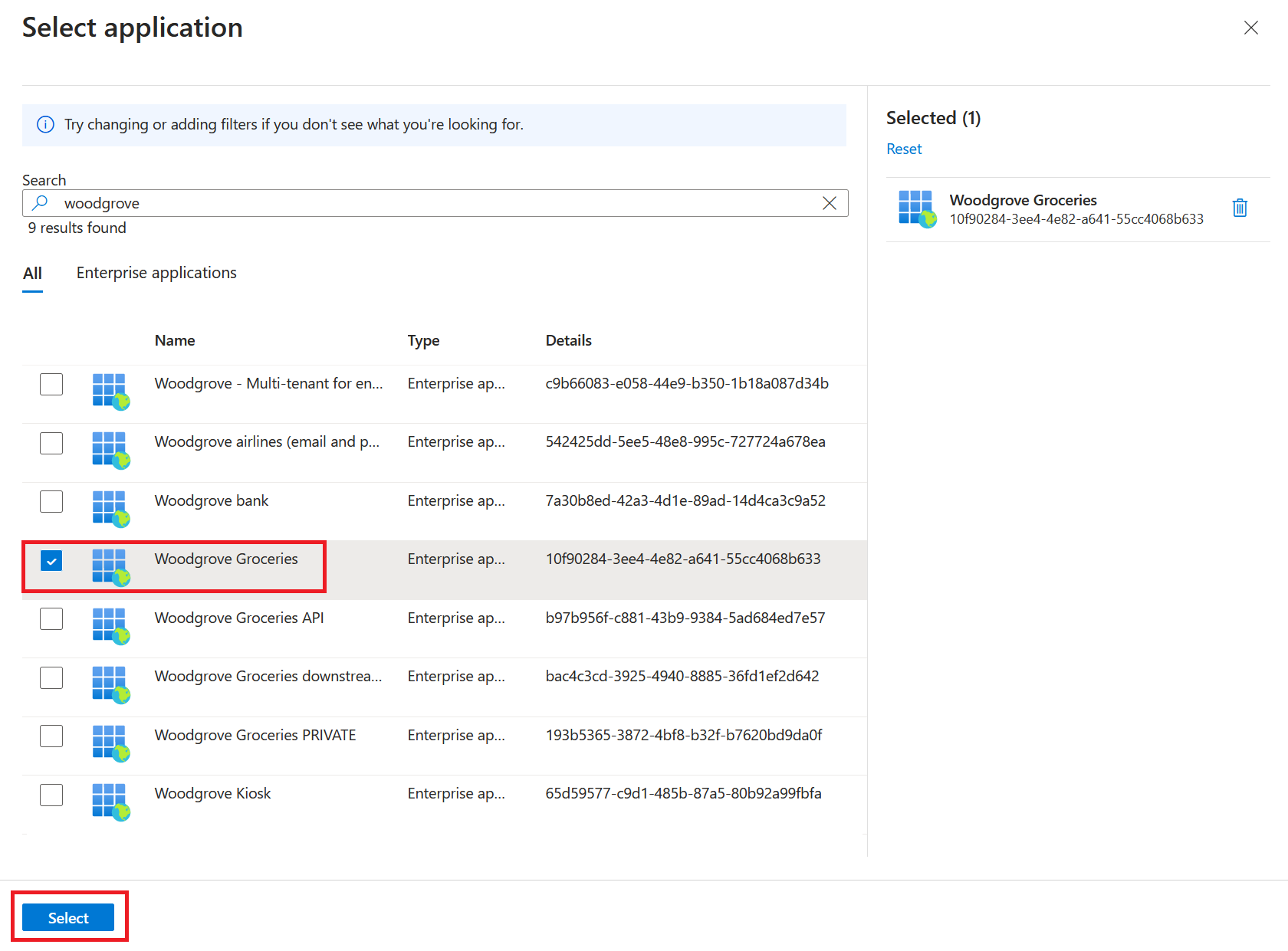 Select the application from the list. Or use the search box to find the application, and then