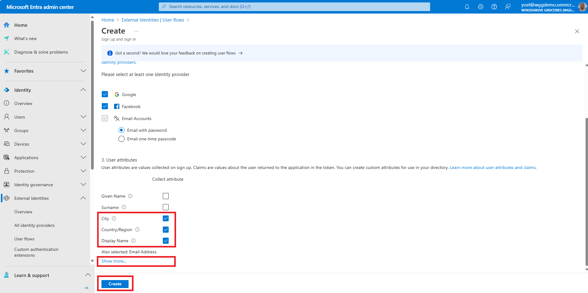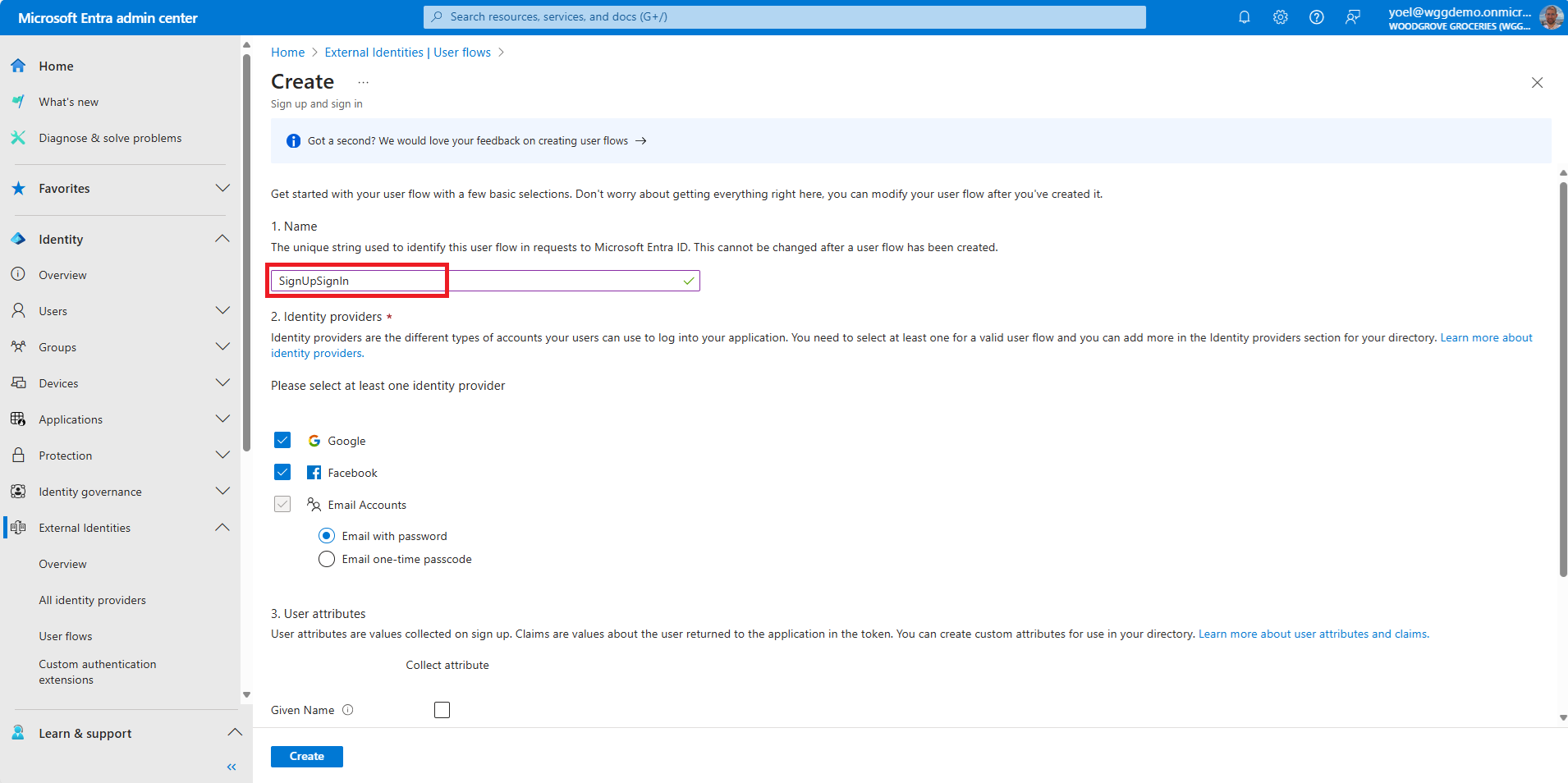 Then, select Create to create the user flow.