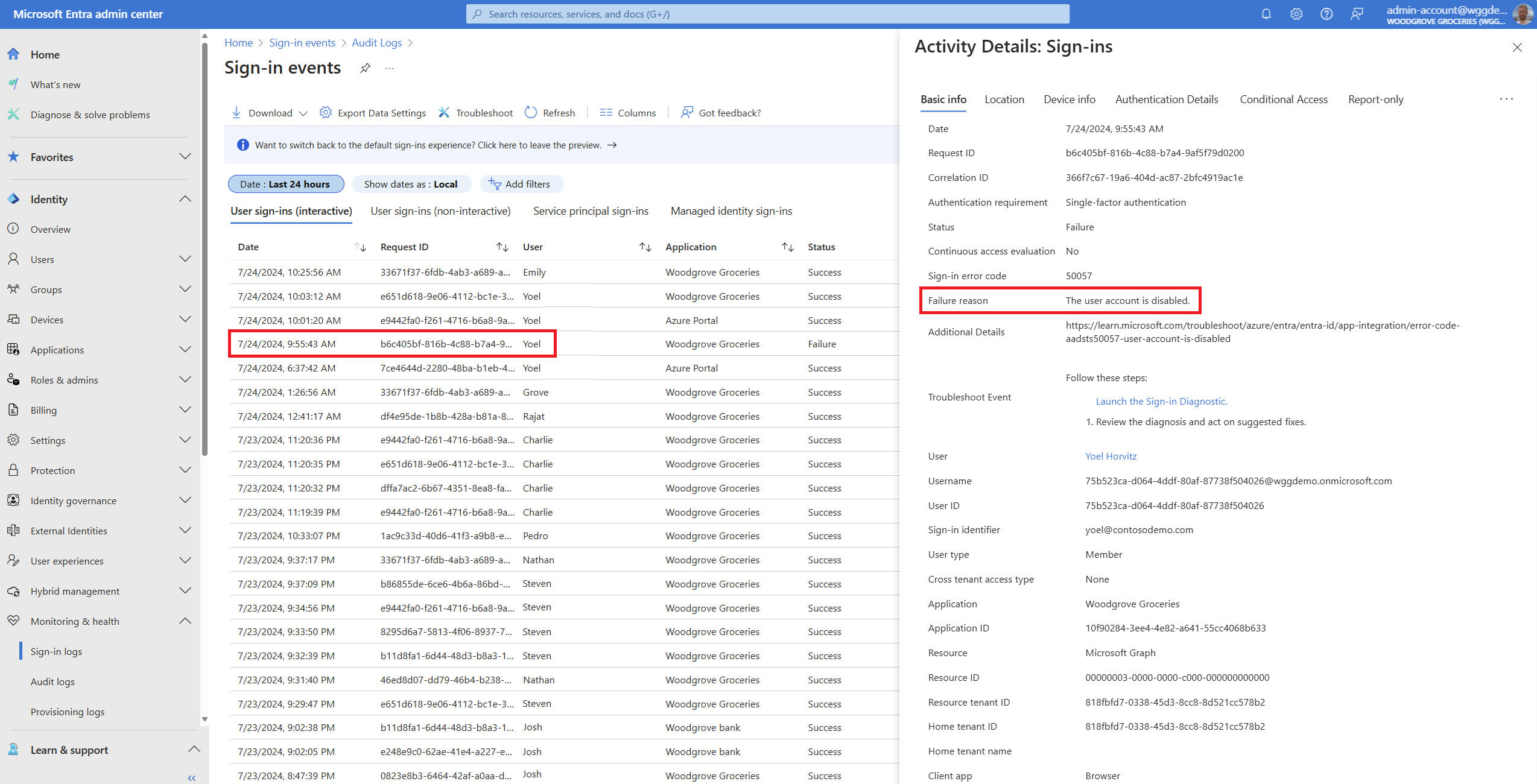 The Activity Details: Sign-ins provides details associated with a sign-in attempt. In the following example, the user couldn't sign-in since the account is disabled.