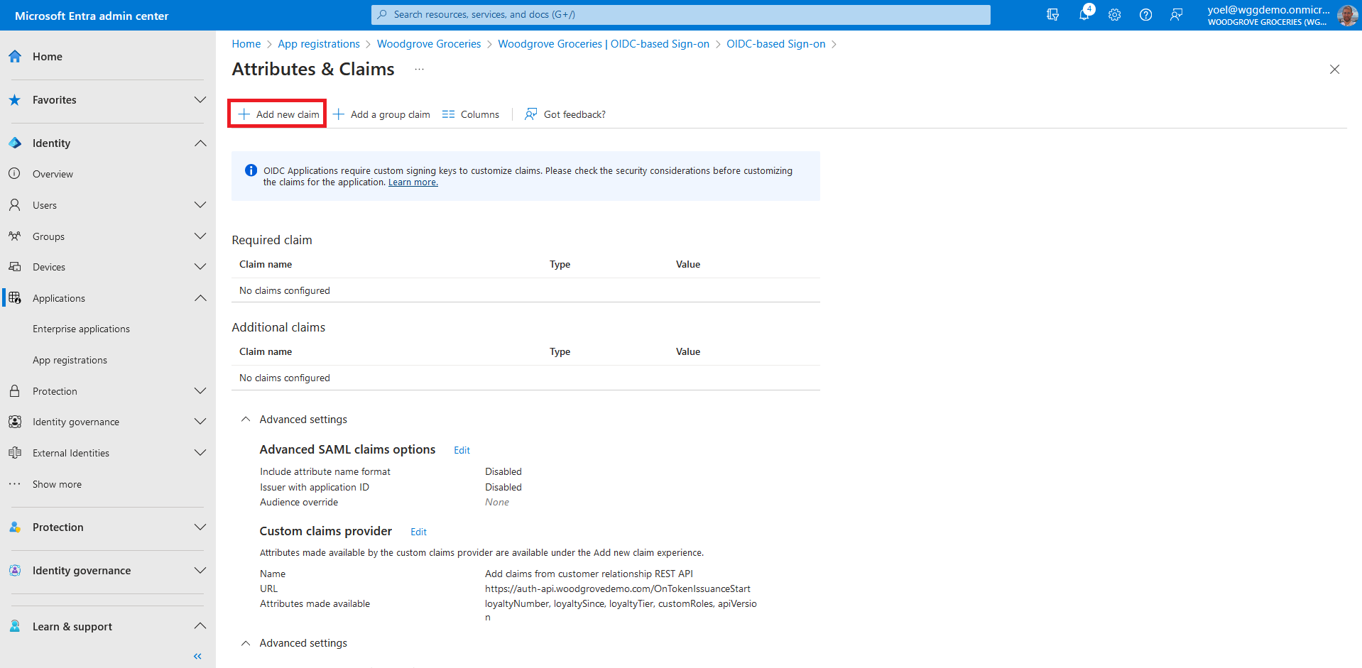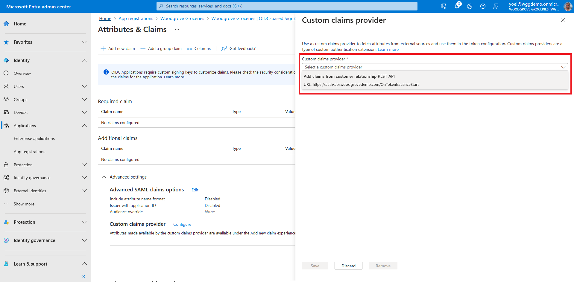 Expand the Advanced settings menu. Next to Custom claims provider, select