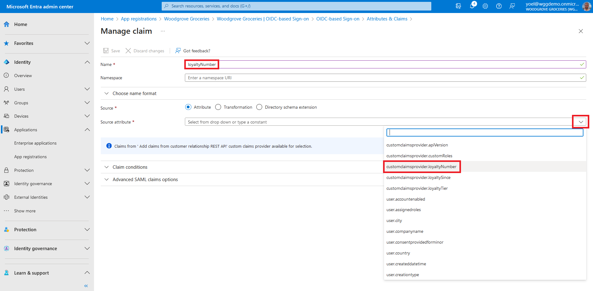 Under Source, select Attribute, and choose customClaimsProvider.loyaltyNumber from
