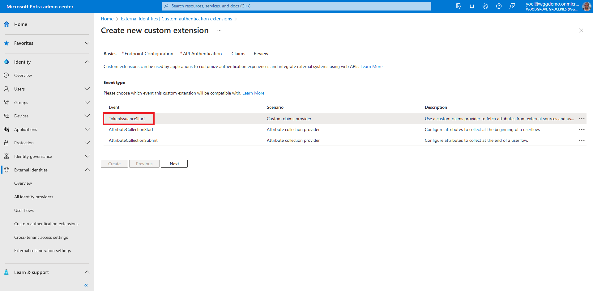 In Basics, select the TokenIssuanceStart event type and select Next.