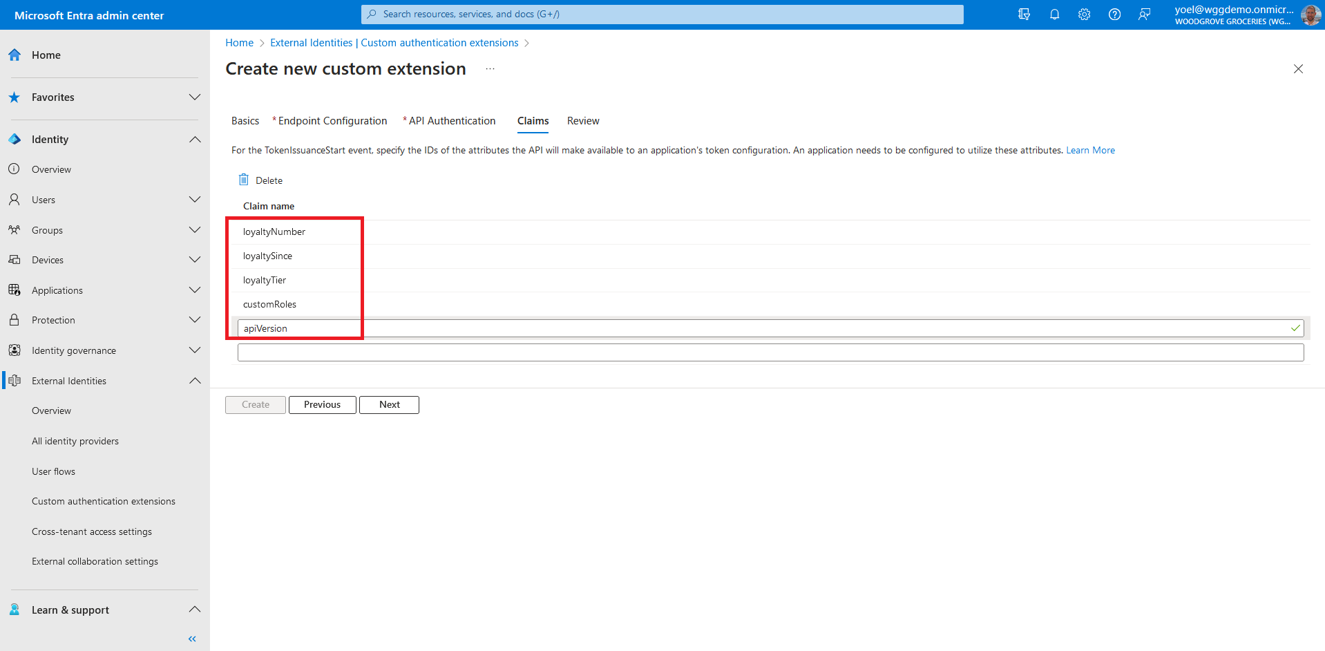 In Claims, enter the attributes that you expect your custom authentication extension to